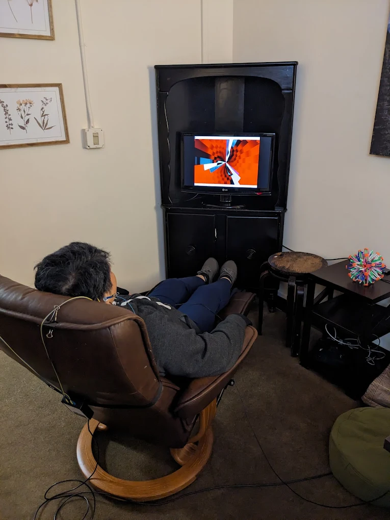 Your visit begins with a discussion of your symptoms, your broader health picture, and whether neurofeedback makes sense as part of your care plan. During the session, sensors are placed on the scalp and ears while you sit comfortably and listen to music or audio. The session itself is passive in the sense that you are not trying to consciously “perform” or make the brain do something specific. The system runs while your brain receives real-time feedback in the background.